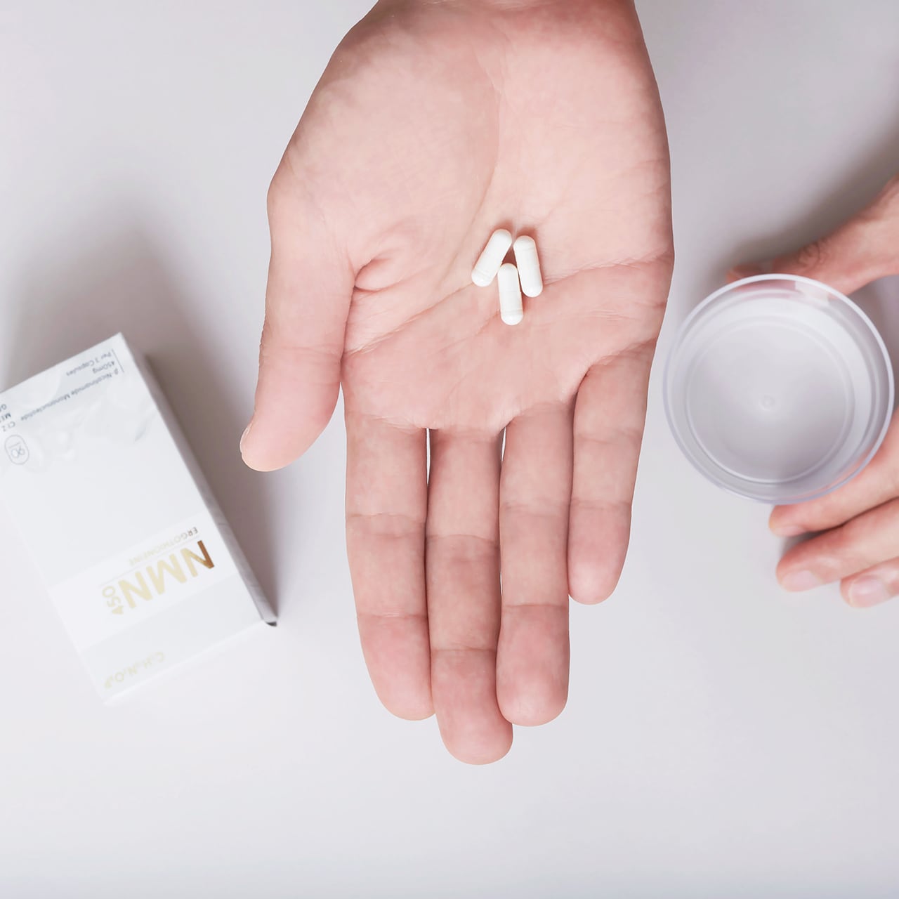 NMNは、「β-ニコチンアミドモノヌクレオチド」の略称で、もともと体内に存在する成分です。 NMNを摂取すると、体内で速やかにNAD+(ニコチンアミドアデニンジヌクレオチド)に変換されます。NAD+はエネルギーを作り出す際に欠かせない補酵素で、健康的で若々しさを保つ働きが確認されています。NAD+が減少すると加齢が始まり、身体機能や認知機能の老化が進と考えられています。そのNAD+に変換されるのがNMNです。NAD+そのものは分子量が大きく吸収されにくいため、代わりにNMNを摂取する方法が効率的にNAD+を増加させると言われています。また、NMNは次世代成分として世界で研究され注目を集めています。